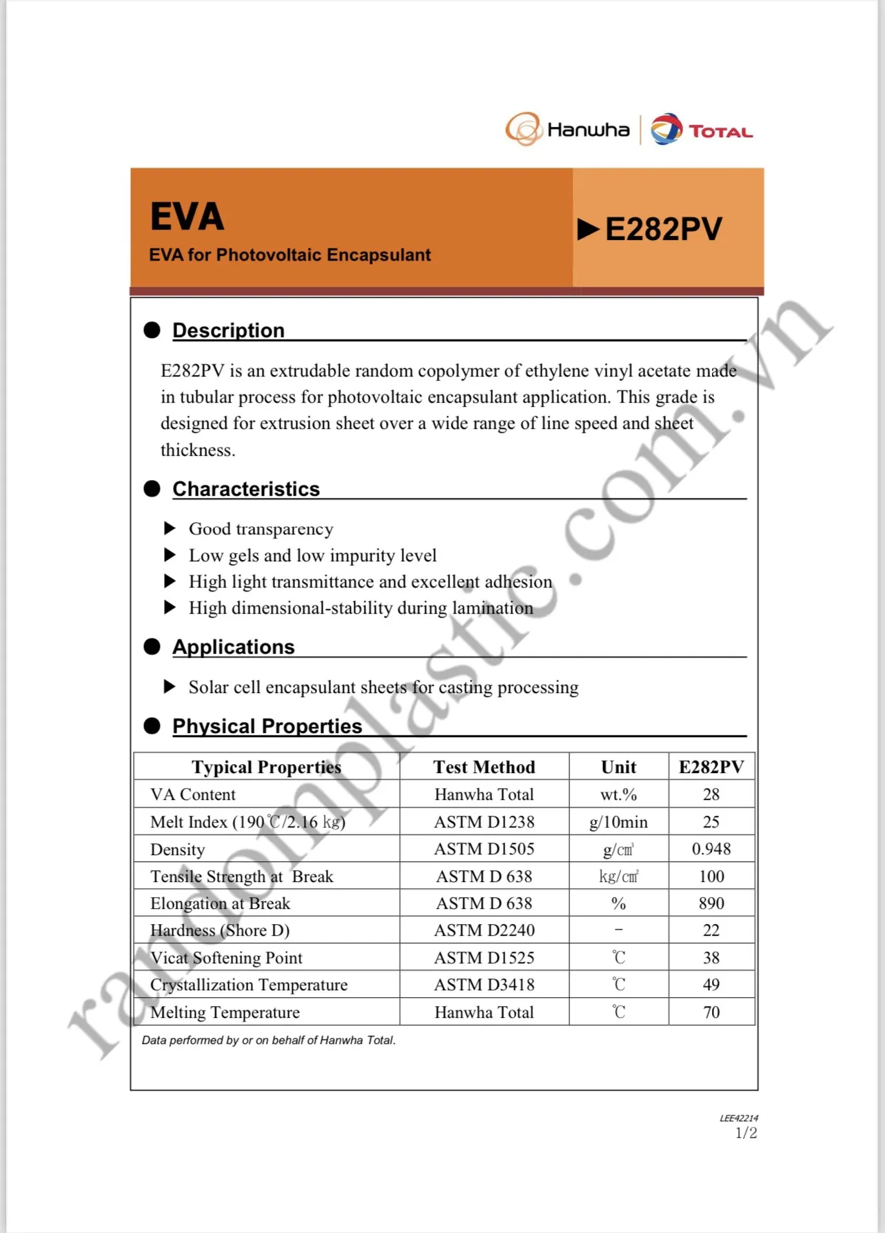 Hạt nhựa EVA E282PV là hạt nhựa được tạo ra do phản ứng trùng hợp của hai chất ethylene/vinylene acetate. Sản phẩm này được tạo ra trong quá trình áp suất cao. Bằng cách kết hợp vinyl axetat (VA) vào Etylen, quá trình áp suất cao tạo ra đồng trùng hợp với EVA.