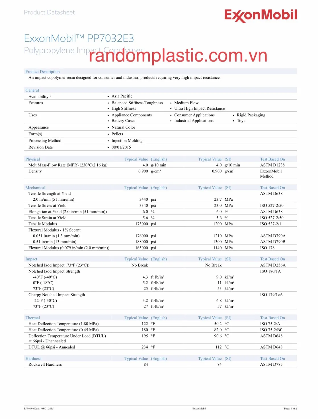 Đặc tính của hạt nhựa nguyên sinh PP 7032e3, hạt nhựa nguyên sinh PP, PP 7032e3