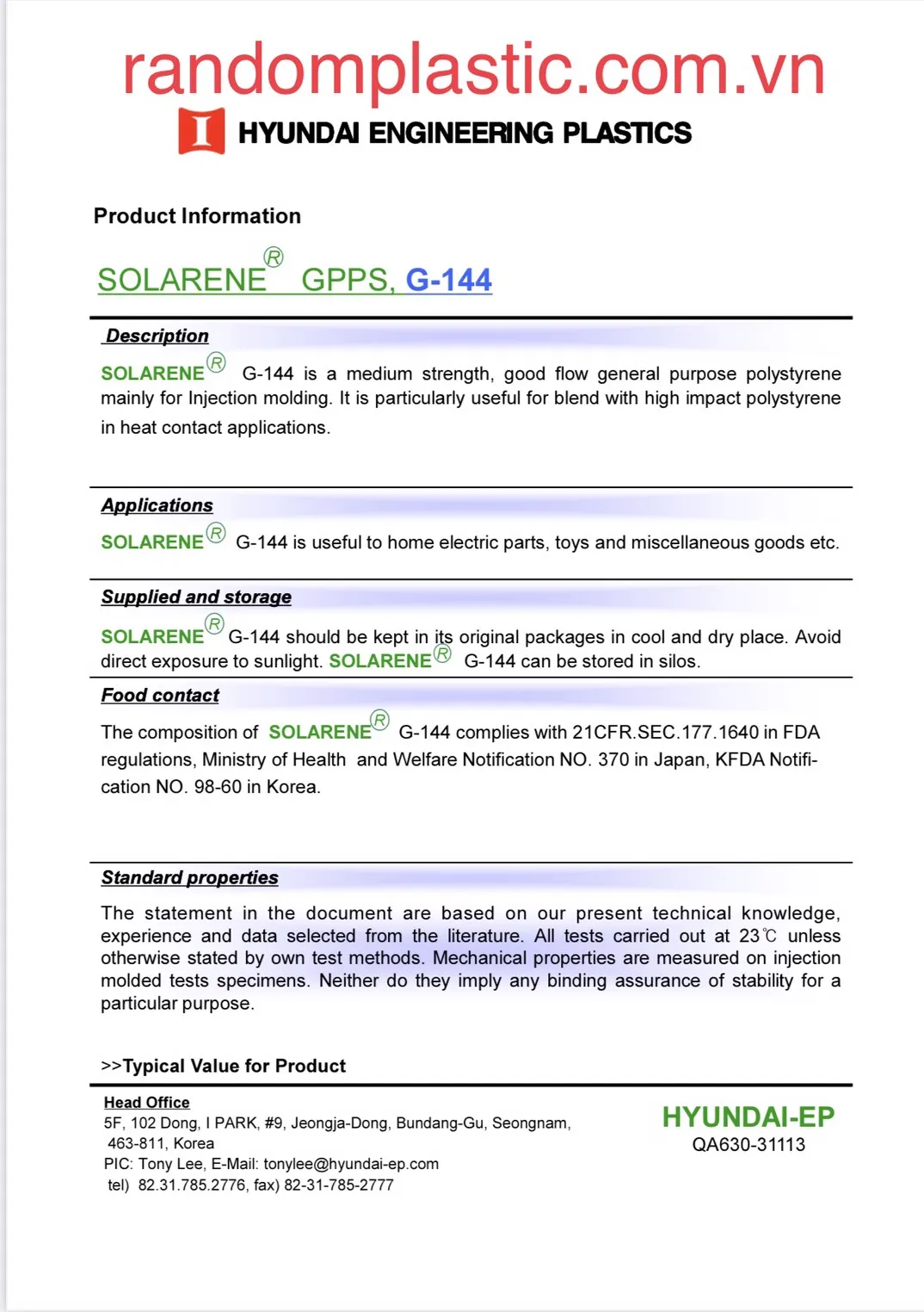 - Hạt nhựa nguyên sinh GPPS G144 là chất dễ tác động bởi nhiệt, ổn định nhiệt, trọng lượng riêng thấp và có giá thành thấp là do chi phí rất thấp của phân xưởng có sử dụng khuôn đúc, ép, màng móng.