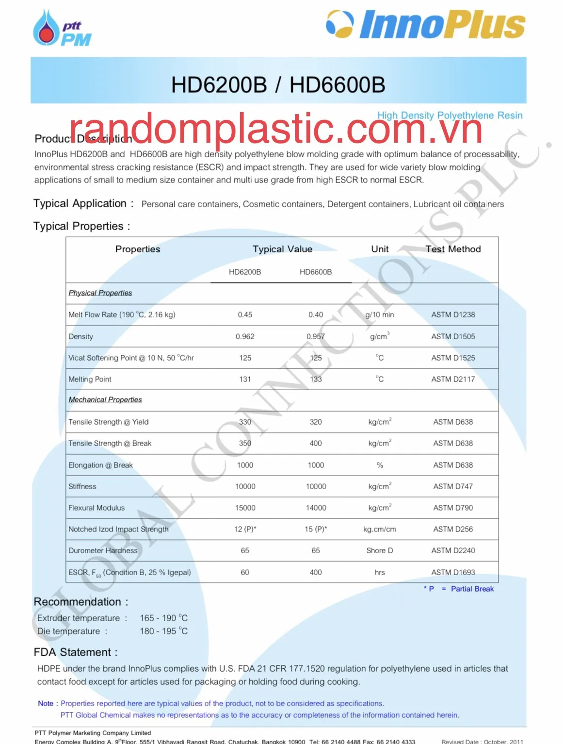 - Hạt nhựa nguyên sinh HDPE 6200 sản xuất bao bì thực phẩm, chai nước.