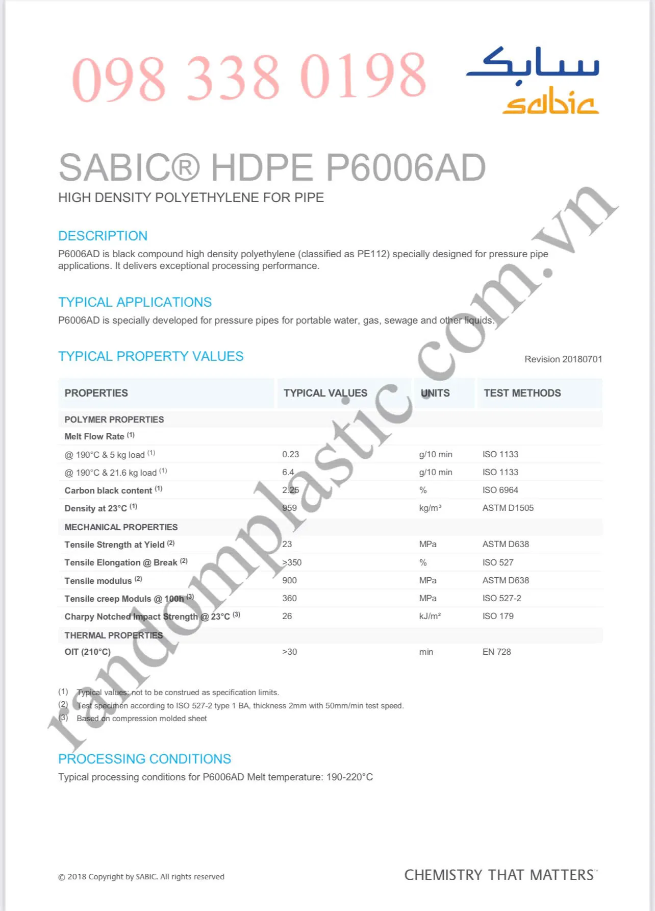 Hạt nhựa HDPE P6006AD là một loại nhựa polyetylen mật độ cao (High Density Polyethylene) được sản xuất bởi nhiều nhà cung cấp, trong đó phổ biến là từ Sabic, SCG hoặc các hãng châu Á khác.