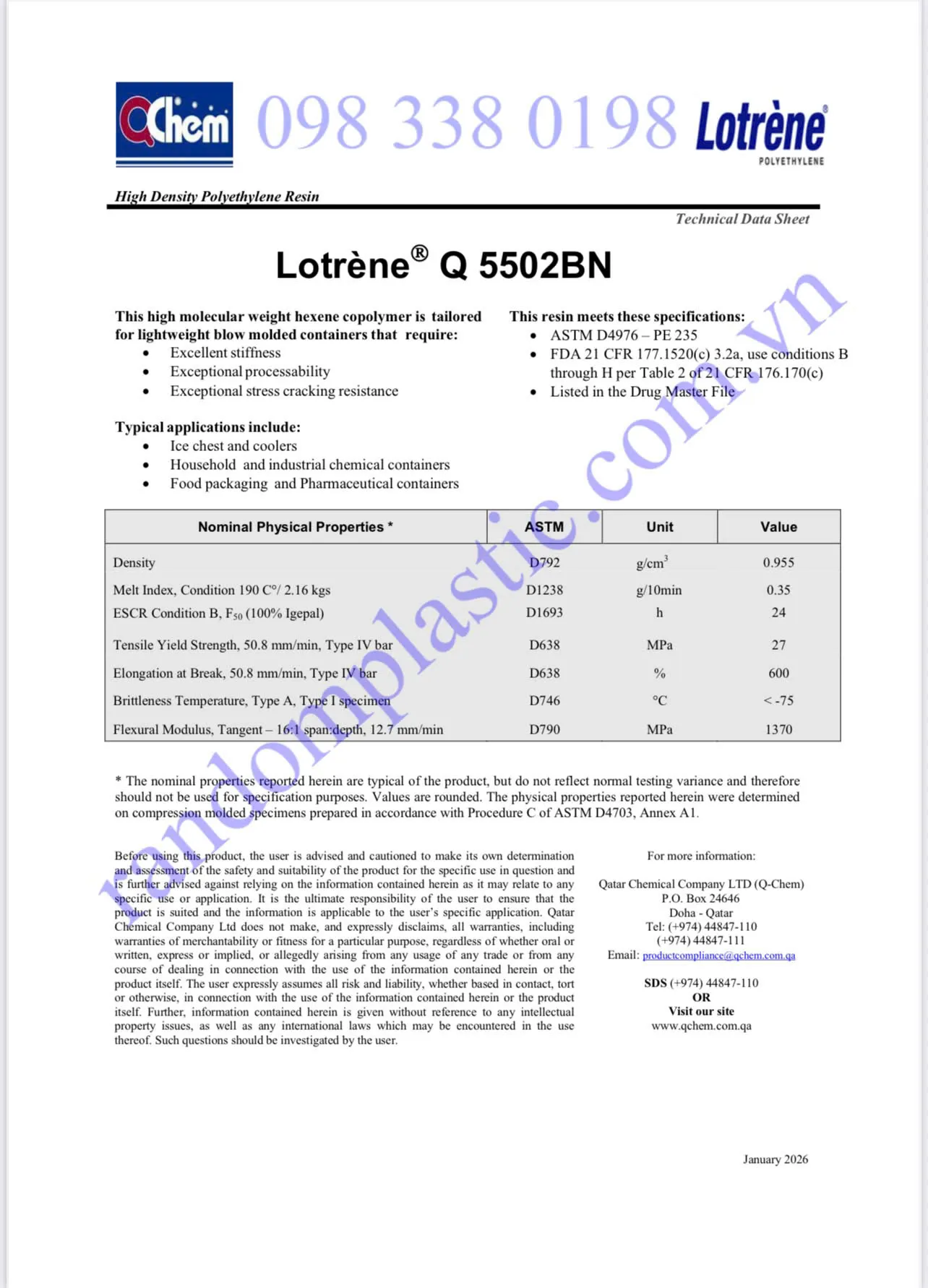 HDPE Q5502BN là một loại nhựa HDPE (High-Density Polyethylene) chuyên blow molding (thổi khuôn) với chỉ số nóng chảy ~0.35 g/10 min, độ cứng và khả năng chống nứt ứng suất rất tốt.
