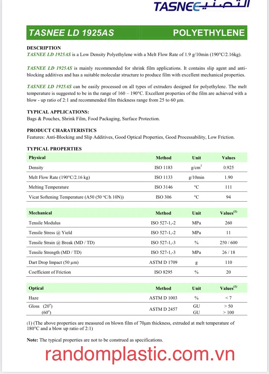 Hạt nhựa LDPE 1925AS là loại nhựa Polyethylene mật độ thấp có đặc tính: trong suốt, mềm dẻo, chống ẩm tốt, khả năng hàn dán nhiệt và chống nứt tốt.