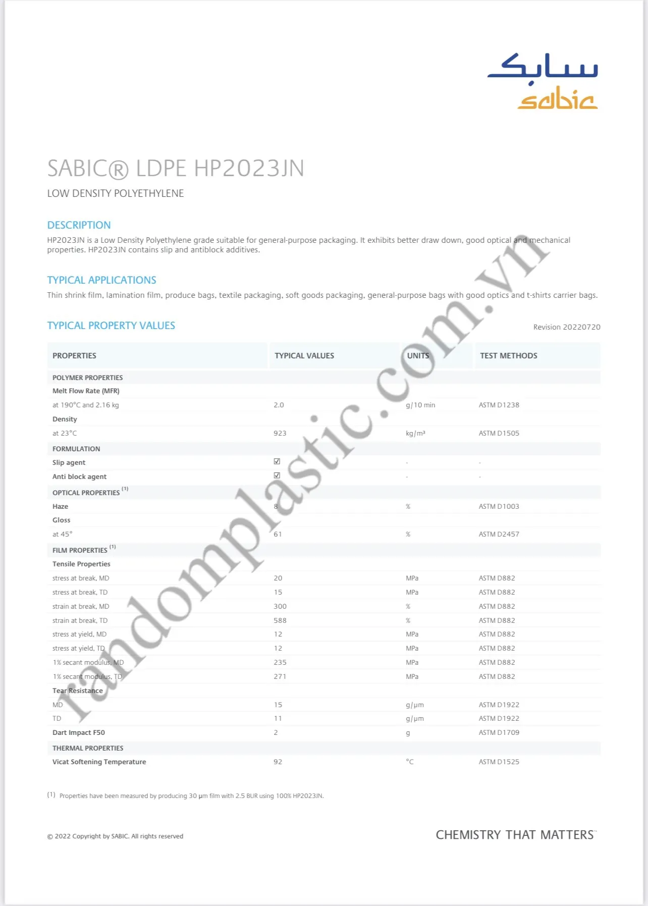 Mã hạt nhựa: LDPE HP2023JN - SABIC