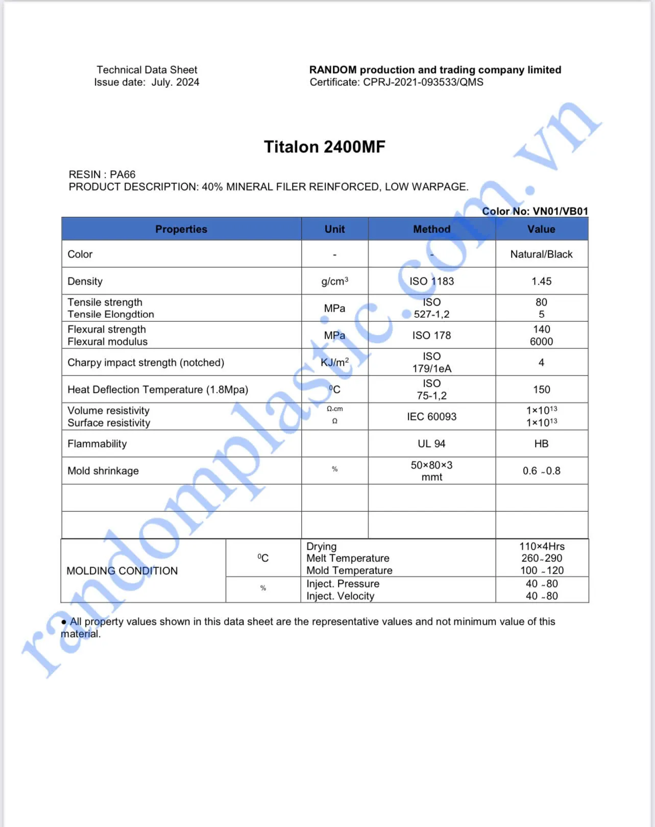 • 40MF (40% Mineral Filled): Là PA66 được trộn thêm 40% bột khoáng (thường là talc, silica, hoặc các khoáng chất khác) để tăng các đặc tính sau:
