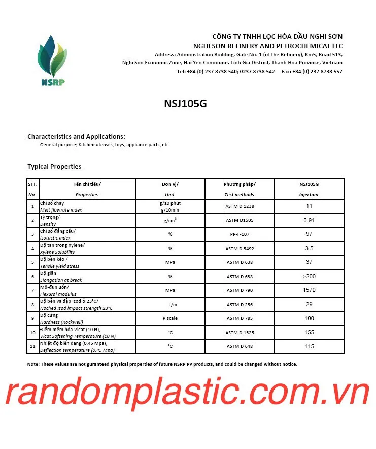 Đặc tính của Hạt nhựa nguyên sinh PP NSJ105G