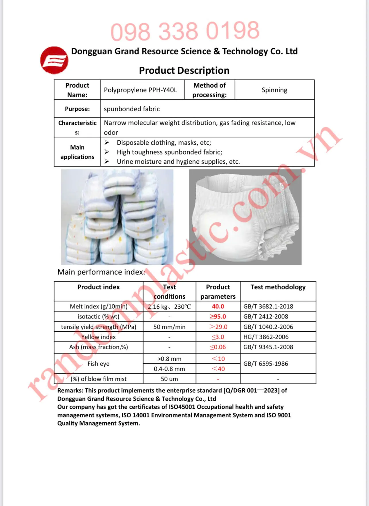 - Hạt nhựa cần được bảo quản tốt: tránh ẩm, tạp chất vì các chỉ tiêu như hàm lượng tro (ash) rất thấp — ≤ 0.06% theo tiêu chuẩn.