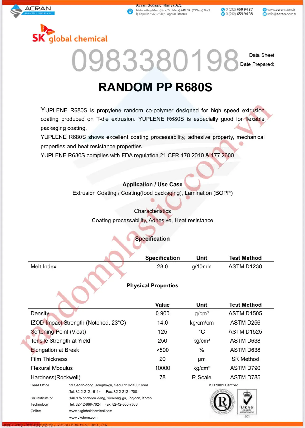 Hạt nhựa nguyên sinh PP R680S: Tính bền cơ học cao (bền xé và bền kéo đứt), khá cứng vững, không mềm dẻo như PE, không bị kéo giãn dài do đó được chế tạo thành sợi.