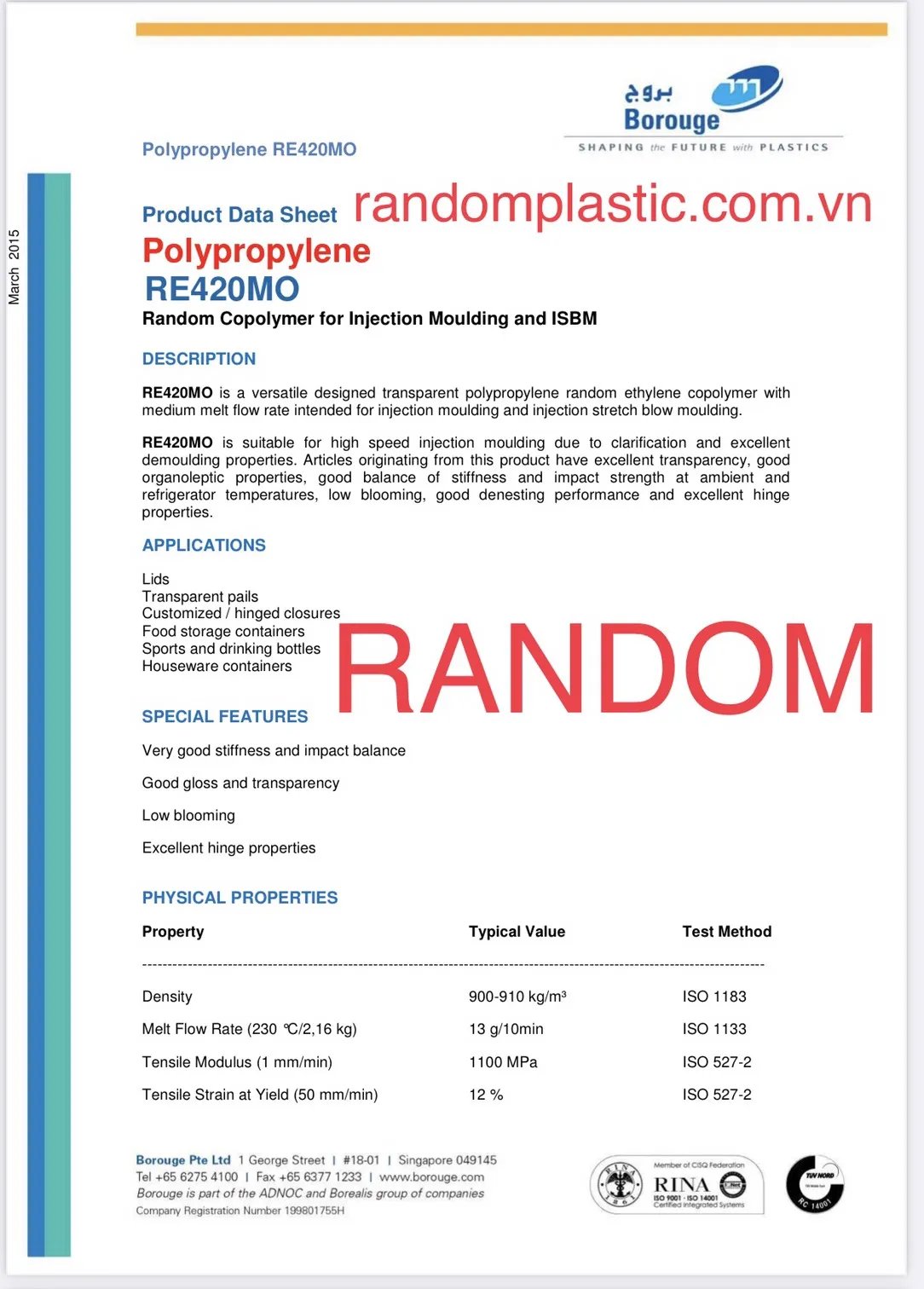 Thuộc tính của hạt nhựa nguyên sinh PP RE420MO
