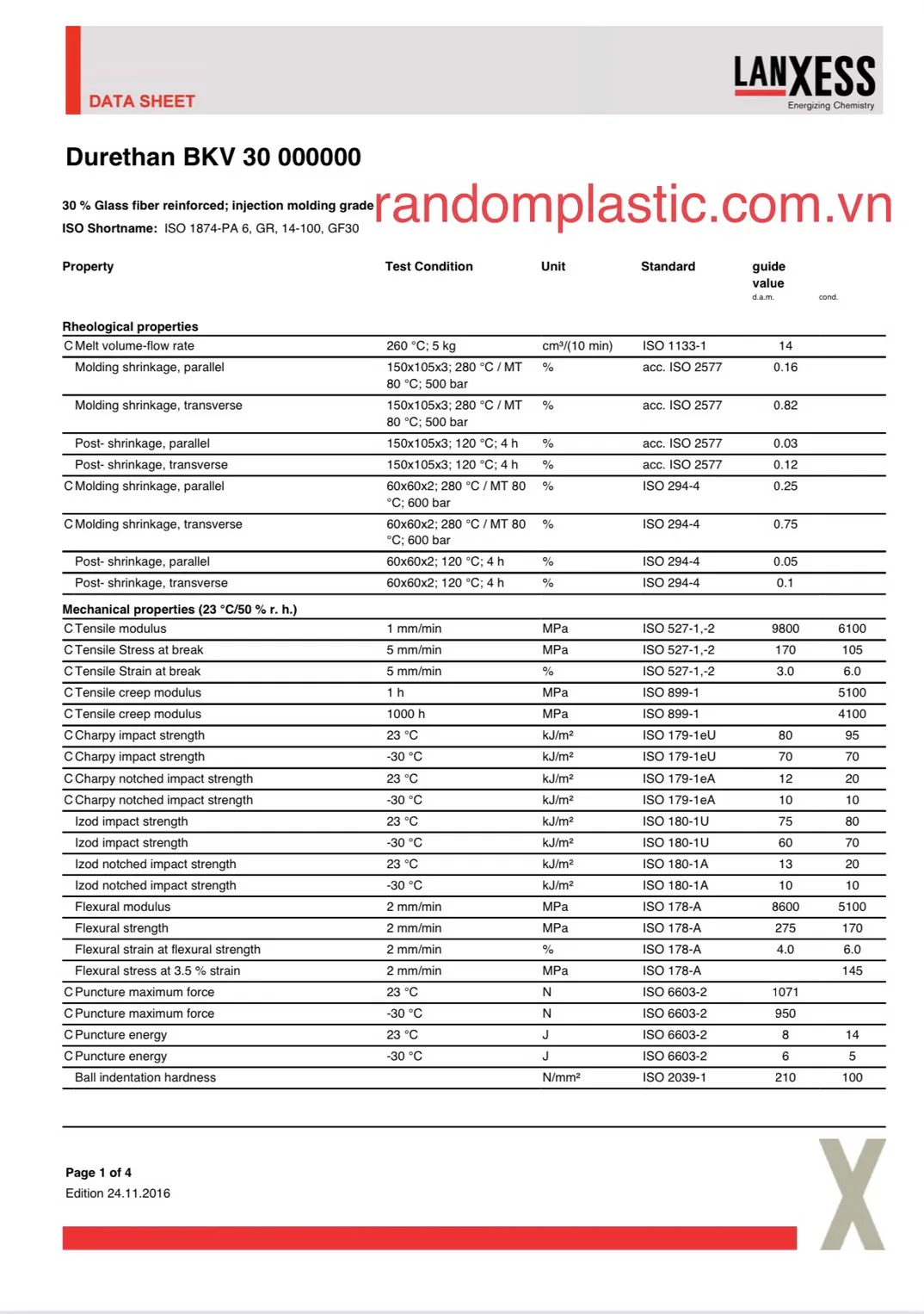 30% Glass fiber reinforced; injection molding grade ISO Shortname: ISO 1874-PA 6, GR, 14-100, GF30 |